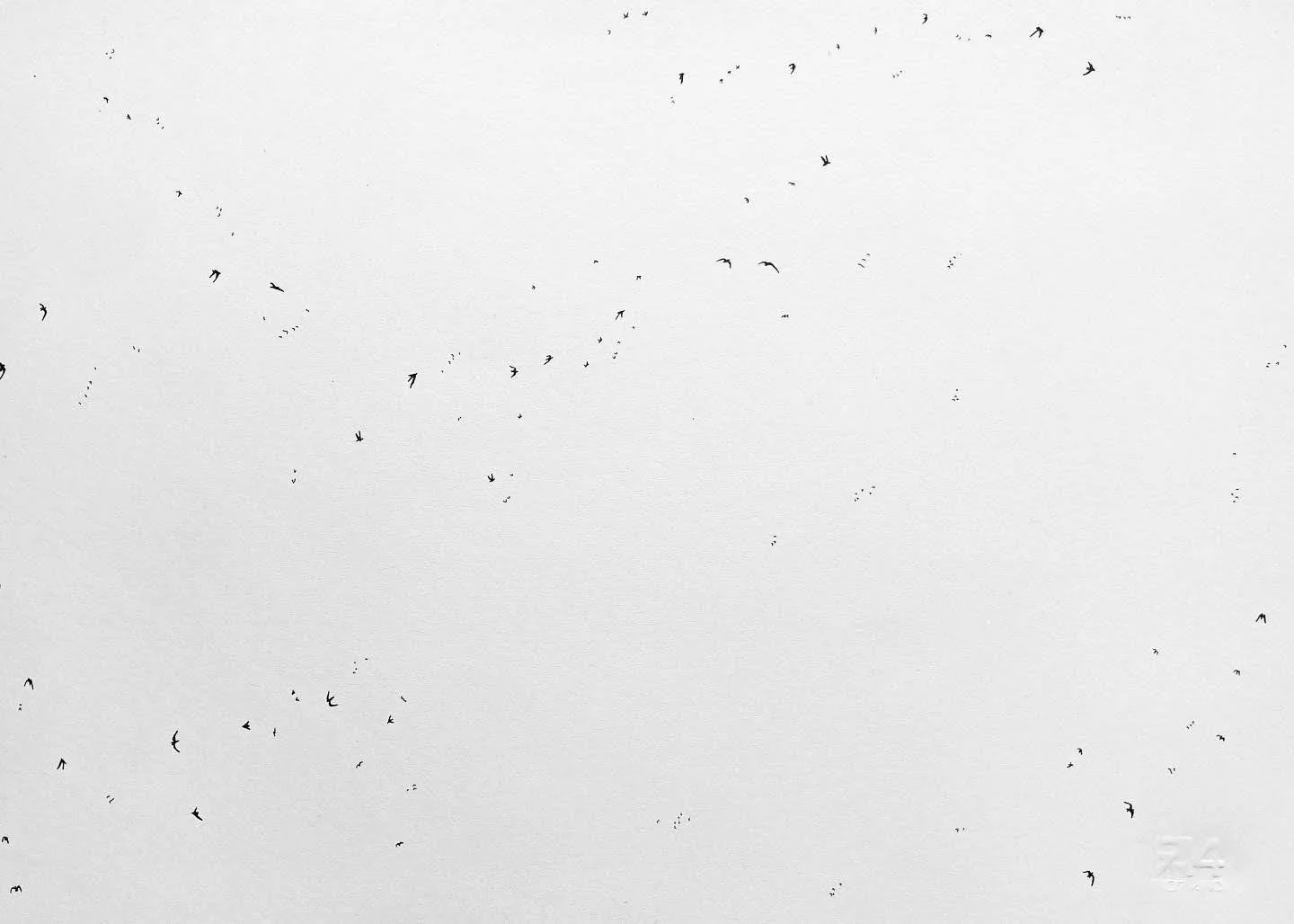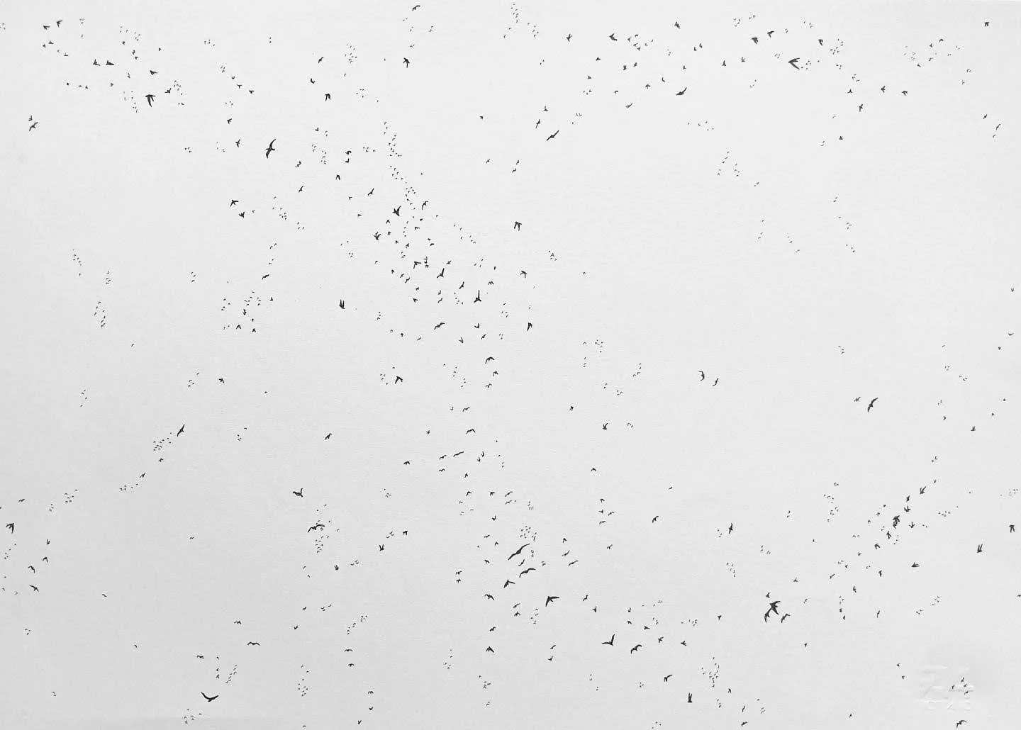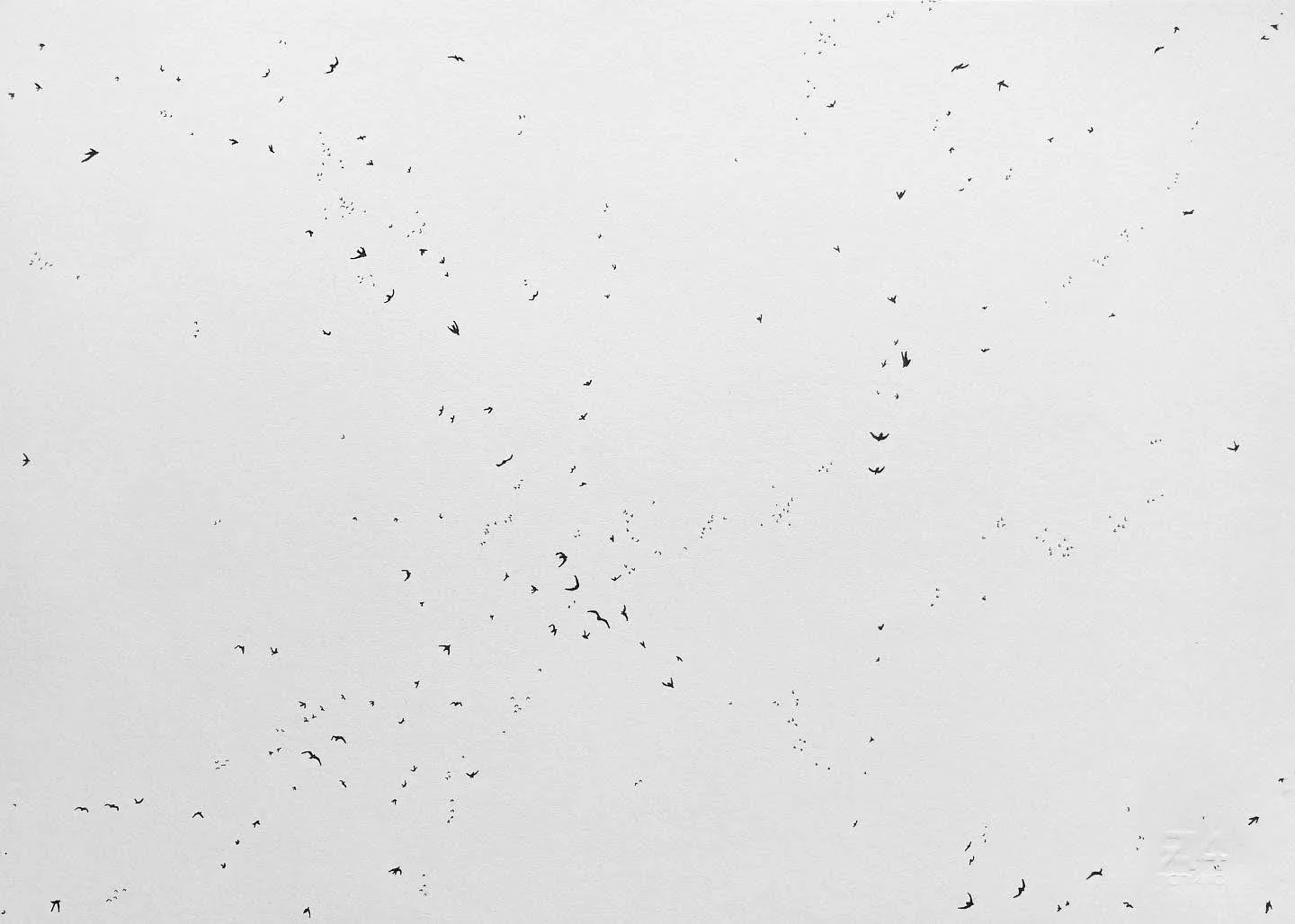 A series of drawings that where completed in the summer of 2023 of a flock of birds dispersing. These drawings are meant to be viewed from the flock being full to the gradual absence of birds, with only sky remaining.